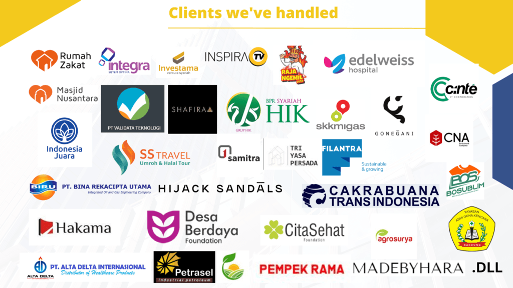 Klien kami dapat mencakup individu, usaha kecil, perusahaan, dan organisasi nirlaba. Kami dapat bekerja dengan klien satu kali untuk proyek tertentu atau memberikan layanan konsultasi berkelanjutan sebagai mitra dan penasihat tepercaya.